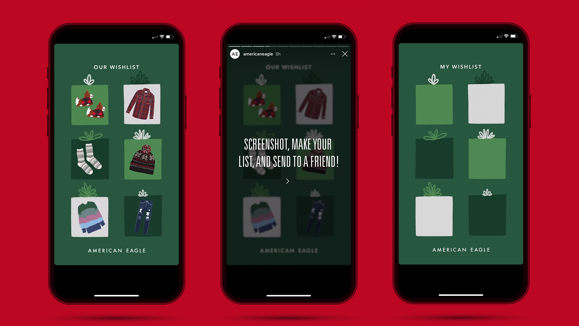 A collection of instagram stickers based on American Eagle’s winter line. I Illustrated and animated the stickers for use via giphy, so they could be accessible in Instagram. In addition to the stickers, I created a frame template for instagram stories that would allow users to share their own holiday wish list and favorite gifts with their followers using the stickers.
